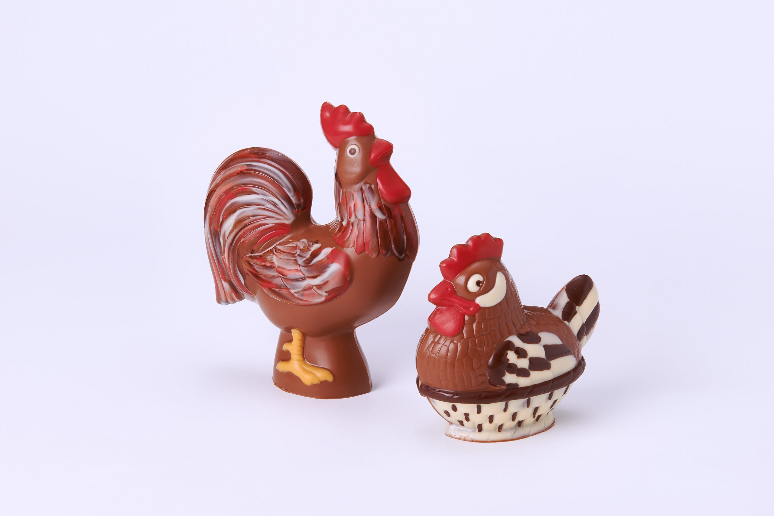 Von Hand geschminkte und gegossene Hohlfiguren „Henriette“ oder „Hahn“ aus feinster Milch- Couverture.